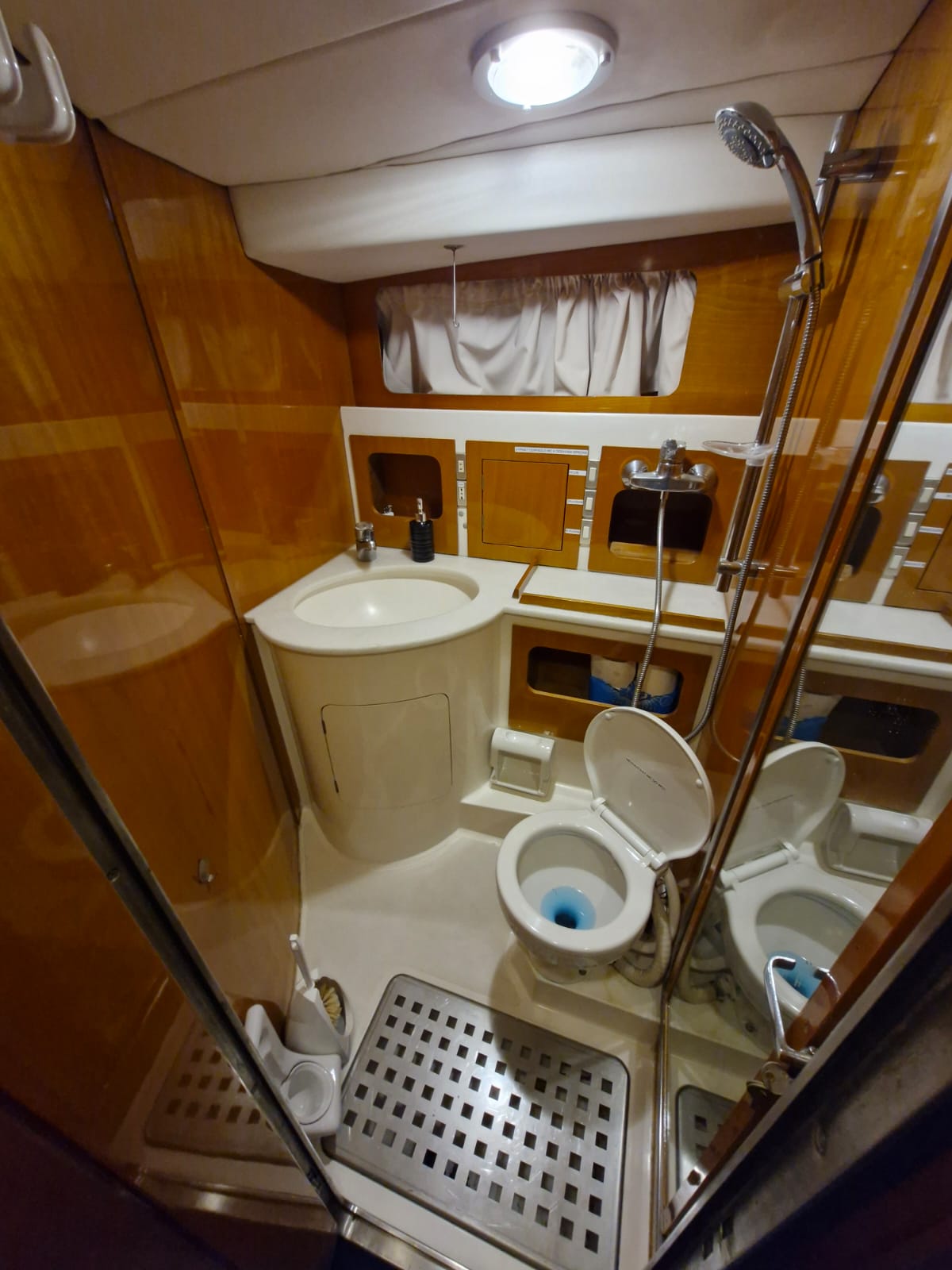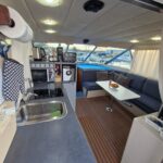 V horním salonu je kompletně vybavená kuchyně.V salonu je klimatizace. V lodi je spoustu úložných prostor v garáži na zádi je možnost uložit kola nebo koloběžky. Na venkovní palubě je venkovní lednice a gril. K posezení zde slouží skládací stůl a židle. Na Flybridge je další kormidelna s poměrně velkou plochou ke které jsou matrace na ev. přespání dalších dvou až třech osob. Na zádi je venkovní sprcha, která je napojená na teplou vodu z bojleru. Venkovní paluba má cca 360×240 cm