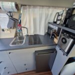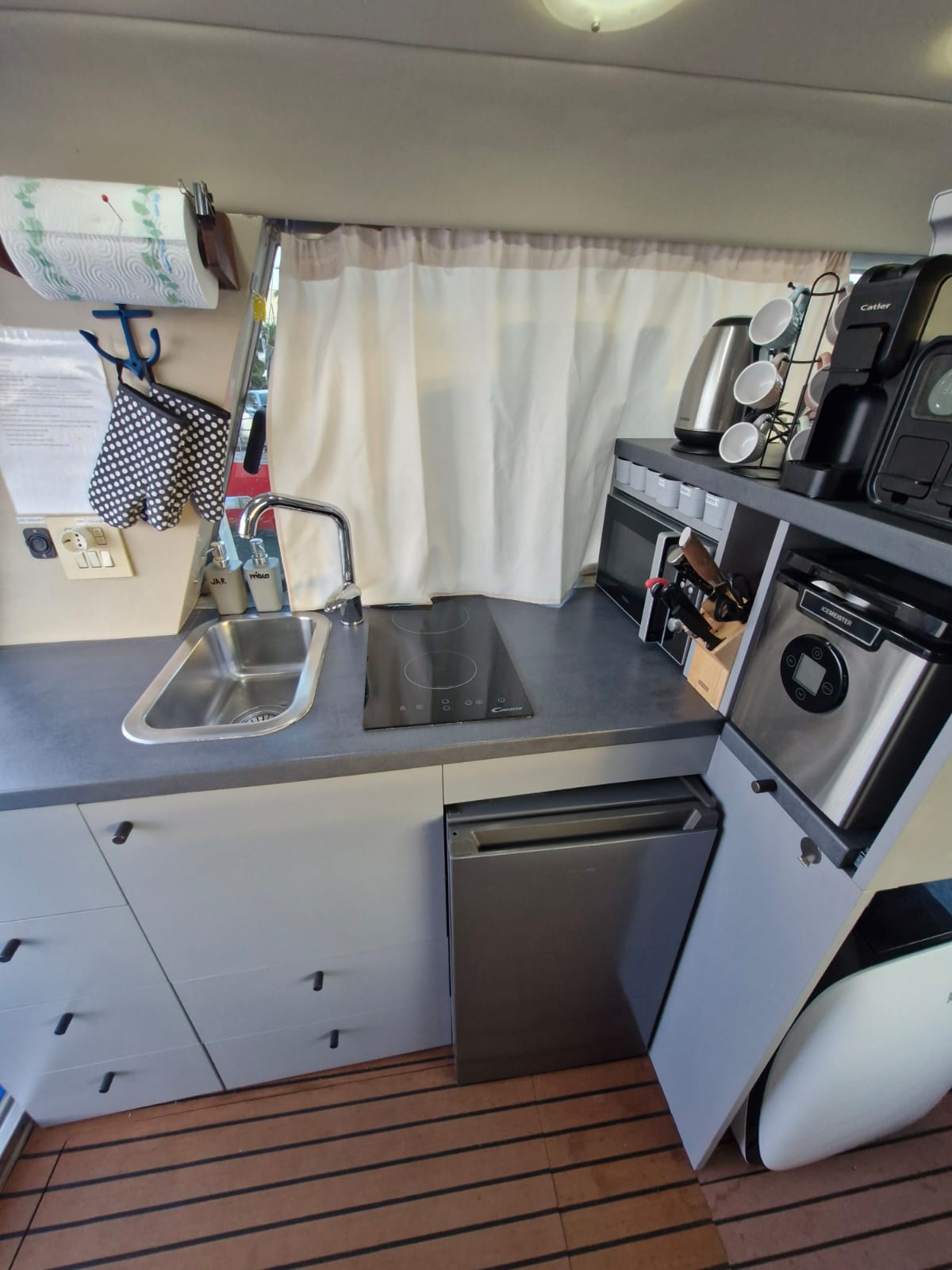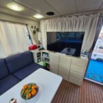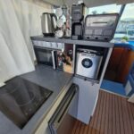 ledovač, kávovar, mikrovlnka, lednička s výmrazníkem, sklokeramická deska s dvouplotýnkou, rychlovarná konvice, 2x klimatizace, závěsný motor 10 hp Honda, nafukovací člun délky 300 cm, paddleboard, velká TV úhlopříčka 125 cm, venkovní lodní gril, 2 lednice, bojler, kompletní stínění na všechna okna, plachta na venkovní stříšku, technická do 8.2.2029.